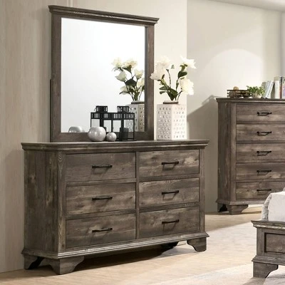 An understated but stylish addition to your bedroom, this transitional six-drawer dresser and mirror is a lovely way to add storage for clothing and accessories. A gray wood grain finish adds detail without overwhelming and sleek black metal bar drawer pulls add a hint of industrial or rustic flair. The dresser is adorned with subtle edge molding and a square mirror frame completes the look with an elegant finishing touch.