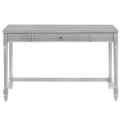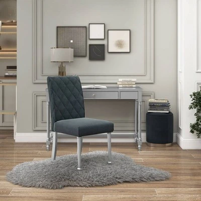 Gleaming in silver, this luxury and glam wood writing desk and chair set brightens your home office with its glam flair. The desk rests on turned style legs that add a classic touch and features one roomy drawer for all your desk supplies and stationery. A glittering, diamond-like drawer pull completes the desk while velvety soft fabric covers the chair for optimal comfort. Diamond tufting adds a perfect finishing touch. This frame is made from recycled lumber, which had its beggings on a rubber tree farm. To prevent the traditional waste of natural resources through burning, rubber trees are retired into furniture.