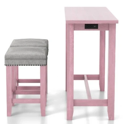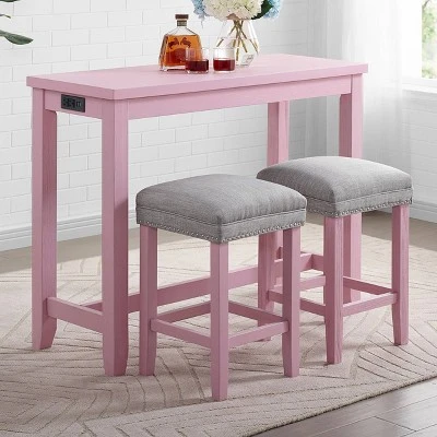 Whether you’re looking to add a breakfast bar or create a place perfect for homework, this three-piece table and stool set is a stylish addition. Its versatile design features a long, narrow tabletop complete with two stools. The table and stools show off a compelling pink finish and the stools are complete with upholstered, backless seats with nailhead trim and built-in footrests for optimal comfort.