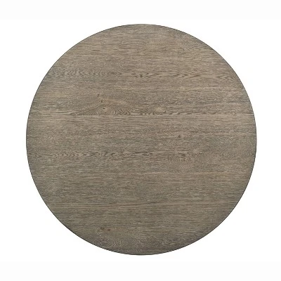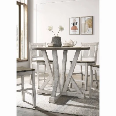 Trestle details and a charming antique white finish emphasize the rustic ambiance of this counter height round dining table. Cremini brown finish complements knotty oak veneer on the tabletop to add richness and contrast in your kitchen or dining room. This eco-friendly frame is constructed from rubberwood, a tropical, solid wood taken from rubber plantations.