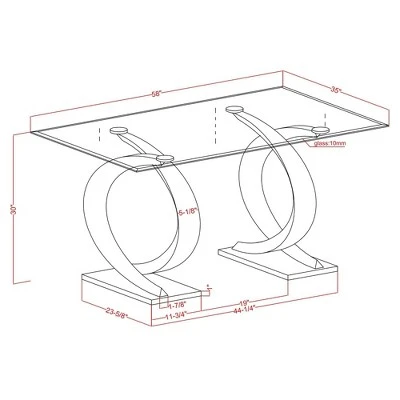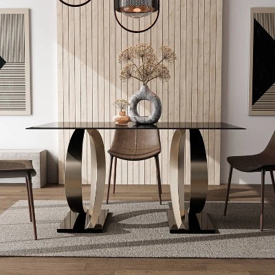 Suffuse your dining room with the modern elegance of this impressive, contemporary rectangular dining table. Two sculpted pedestals feature opposing C-shaped, wave-like forms in a champagne finish, creating a rich, dynamic visual presentation. The waves sit on glossy black platforms that add stability and stylish contrast. The tabletop is a gorgeous piece of smoky gray glass with a beveled edge that adds a classic finishing touch.