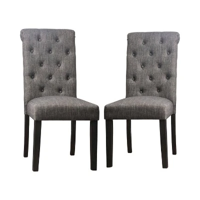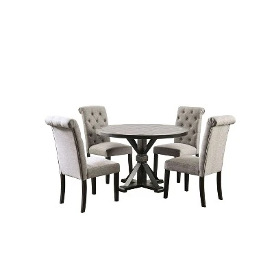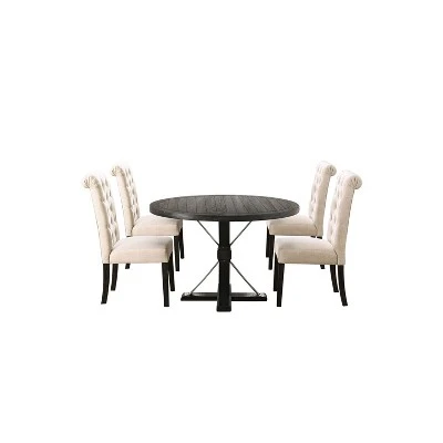 A trestle style base adds rustic depth and detail to this impressive five-piece dining set, which features a round tabletop and four comfortable chairs. Offering a refined edge to rustic decor, this inviting set features an antique black finish with light distressing that creates a sense of vintage authenticity. Chairs boast rolled backs with linen-look fabric upholstery and button tufting that ensure comfort and support perfect for relaxing over a delicious brunch or dinner.