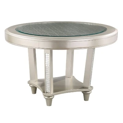 Introduce unparalleled glamour with this five-piece round dining table set in gold-tone. A stunning centerpiece for your dining room, the table boasts a shimmering champagne finish to complement solid wood and wood veneer construction. Textured details augment a clear tempered glass tabletop that creates a clean, smooth surface for delicious dinners. Chairs boast a contoured back with button tufting over warm gray faux leather for a lush look and feel.