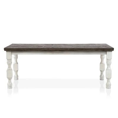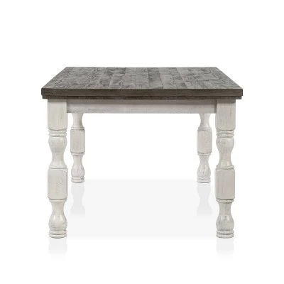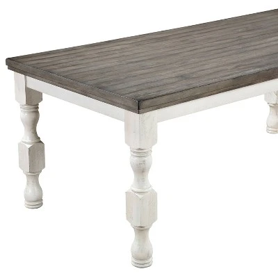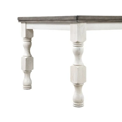 Create a cozy and welcoming family gathering space with this rectangular dining table. Featuring rustic details in roughhewn wood and an antique white finish, the table is augmented with a gray wood tabletop that creates a 2-tone effect and lends aged authenticity to the overall design. Table legs are substantial turned posts that add decorative flair and dimensionality to this lovely dining table.