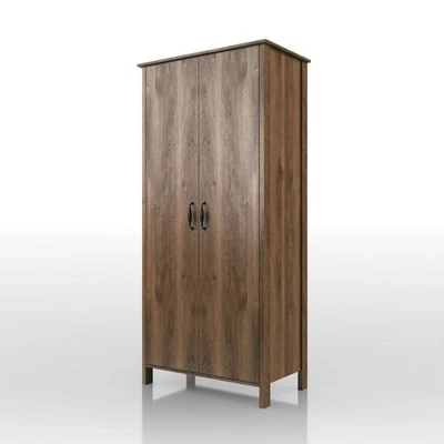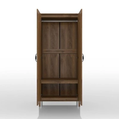 Style and storage all in one. This rustic wardrobe offers additional storage options for your home without having to sacrifice style. Behind its two large doors is a spacious hanging storage area that includes shelf storage for 2. These versatile shelves are ideal for storing a variety of different items such as spare blankets, stacks of shirts, board games and more. You can find places for all your items. You can find a place for all of your stuff. Its stunning style and versatile design make this storage cabinet a great addition to any room in your home – living room, office, or even laundry room. It looks great no matter where it stands. With an MDF finish and attractive hardware, this two-door wardrobe with shelves will have you feeling organized in no time.
