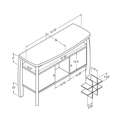Built to showcase sophisticated Modern style, the Angla Bold Curved Dining Buffet by ioHOMES does that and more. Chrome pull accents open up to spacious cabinet space while the grid style wine rack showcases your vast collection of wine. The central shelf features a generous surface for stowing plates and bowls as the smooth rounded top displays spirits, dƩcor and more. Bowed legs adds distinguished arching curvature and a Cappuccino finish elevates with deep brown tones.