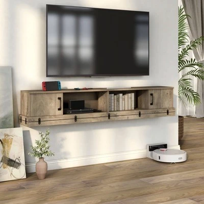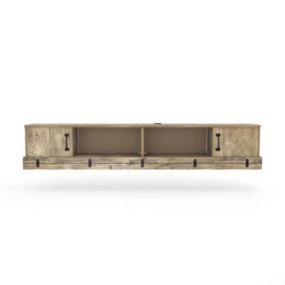 This industrial-inspired mountable TV console is perfect for a rustic or farmhouse-style living room. The black bolt brackets and bar pulls are combined with a touch of modern industrial design. A wire hole with grommet insert on top will guide wires from your entertainment center to keep an organized look.