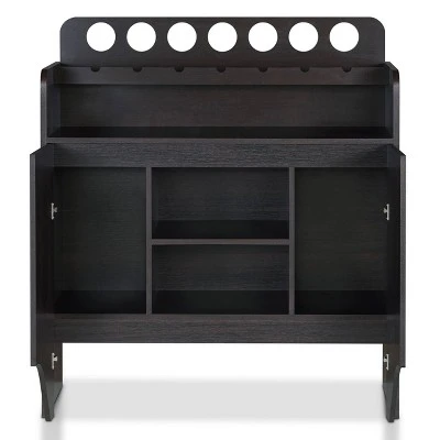 The stylish appeal of the Belfi buffet server by Homes: Inside + Out is easy to see with its sleek silhouette and deep espresso brown finish. A wine rack gives you space to keep up to seven bottles of your favorite wine handy in the dining room. The server features a compact silhouette that minimizes floor space and is perfect for small dining spaces. Plenty of open shelving is ideal for bar accessories while two cabinets create an easy space to tuck away entertaining essentials.