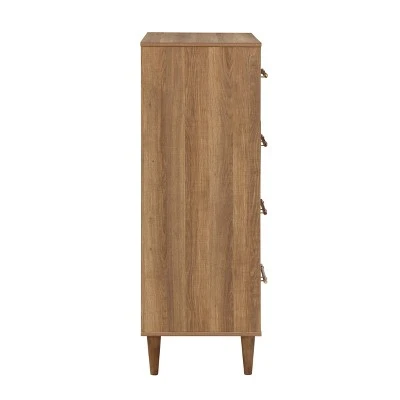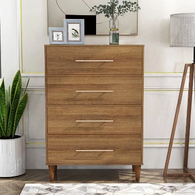A chest of drawers with farmhouse charm sets the tone for the rest of your bedroom. This 4-drawer tall dresser boasts ample interior storage with spacious drawers perfect for everything from clothing and linens to hobby supplies. The chest features a light oak wood grain finish for a rustic touch, while long, sleek bar drawer pulls add a modern component. Tapered legs complete the look to perfection.