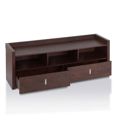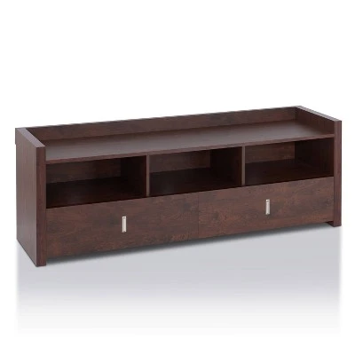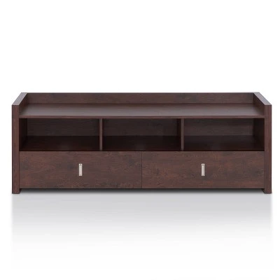 The sleek, modern silhouette of this transitional wood 60-inch TV stand from Furniture of America keeps bold style front and center in your living room, family room or den. A minimalist aesthetic delivers clean, simple lines to complement the rich vintage walnut finish. Three spacious open shelves display and store electronics and other items, in addition to two roomy pullout drawers below.