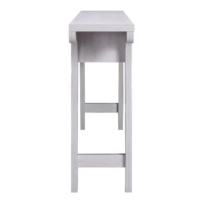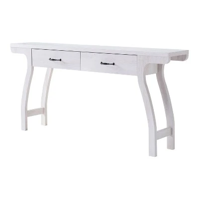 A transitional console table mingles into a hallway for a convenient stash-away place. Two spacious drawers on smooth metal glides offer space for keys and mail. With a curved silhouette, a gorgeous white oak finish, and classic black bar pulls, this hallway console makes quite the addition to your home.