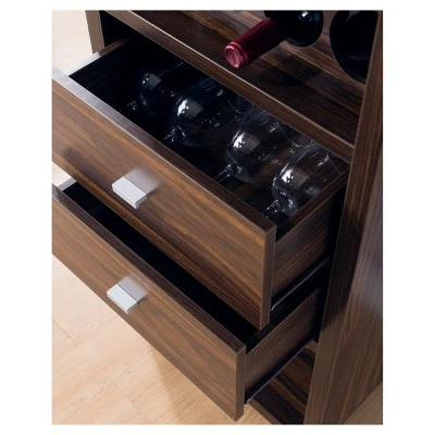 The tall, slim structure of the ioHOMES Sierri Contemporary Wine Cabinet in Dark Walnut by HOMES: Inside + Out is perfect for fitting in compact spaces. The wood grain details and rounded corners give a subtle retro feel to update a space and add amazing personality. The frame features multiple shelves, drawers, and a built-in wine rack to store a plethora of kitchen and dining necessities.