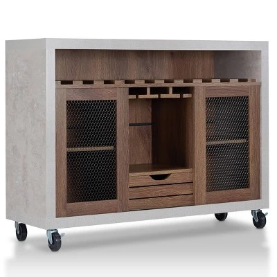 Let entertaining become effortless with the Homes: Inside + Out Willis Industrial Dining Buffet in Walnut by HOMES: Inside + Out. The built-in wine and stemware racks make bottles of vintage and serving glasses close at hand, while the multiple storage compartments keep dishes and silverware neatly organized and ready at a moment’s notice. A cement-like frame and mesh door inserts add a rustic character that changes up the clean linear silhouette so that any design style can be emphasized.
