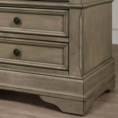 Rustic finishes bring an accessible, inviting look to this transitional three-drawer nightstand. A gorgeous addition in your elegant bedroom, it boasts a lovely antique warm gray finish paired with classical trim molding and carved details that create the illusion of old world columns. The drawers add bedside storage and are accented with round knobs for easy, stylish access. Bracket feet complete this exceptional design. This frame is made from recycled lumber, which had its beggings on a rubber tree farm. To prevent the transitional waste of natural resources through burning, rubber trees are retired into furniture.