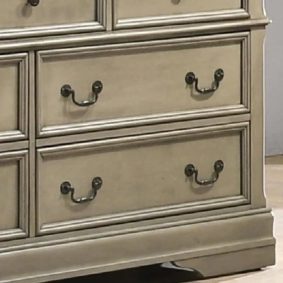 Rustic finishes bring an accessible, inviting look to this traditional seven-drawer dresser. A gorgeous addition in your elegant bedroom, it boasts a lovely antique warm gray finish paired with classical trim molding and carved details that create the illusion of old world columns. Three top drawers feature round knobs while four lower storage drawers show off two drop down pulls for easy, stylish access. Bracket feet complete this exceptional design. This frame is made from recycled lumber, which had its beggings on a rubber tree farm. To prevent the traditional waste of natural resources through burning, rubber trees are retired into furniture.