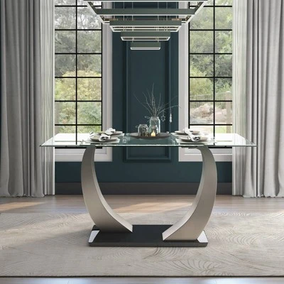 With eye-catching, abstract shapes the Langton Metal Dining Table in Satin by Homes: Inside + Out brings the art gallery to your home. The eye is immediately drawn to the powder coated, satin plated metal legs that gracefully curve to the center. A glossy, black finished base contrasts with the sleek, satin finished legs. To top it off, the table features a tempered, glass top that creates an open, airy design perfect for small spaces. Wow guests with this simply magnificent Homes: Inside + Out Langton Metal Dining Table in Satin.