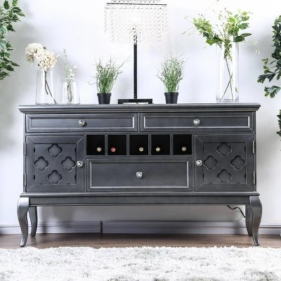 The Maja Wood Server features a dark gray finish with distinguished Moroccan-inspired inset patterning and beautiful crown molding. Showcase decor on the wide tabletop while two cabinets and three drawers provide spacious storage for glasses, dinnerware and more. Keep your favorite wine handy with one of five wind rack slots and conveniently store bottle openers with the server’s top drawers. Enhanced by luxurious and bold cabriole legs, the Sante Server makes a bold elegant statement.