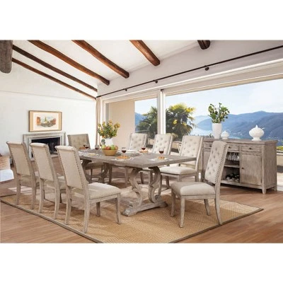 Ornate, artistic style greets your dining space with the Medina Rectangular Wood Dining Table from HOMES: Inside + Out. Stylish double pedestals boast an intricately curved design for elegant appeal, while a wood tabletop brings timeless detail and a sleek aesthetic. The natural, versatile finish makes it easy to accessorize with your favorite table settings, making this rectangle dining table the perfect piece to show off your personal style. Choose coordinating chairs to make this a set worth showcasing.