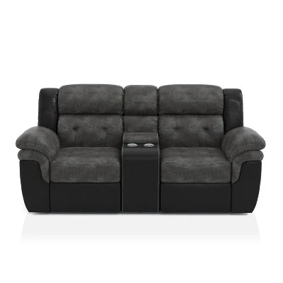 A perfect blend of style and relaxed comfort, this transitional recliner loveseat is ideal for a family room. It includes two recliners designed for optimal comfort with a storage console with cupholders in the middle. Its stylish upholstery is crafted in fabric-like vinyl and features a two-tone combination of stone gray and sleek black. Contrast stitching adds detail while ultra-plush pillowtop arms and tufted back cushions complete the look.