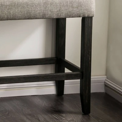 Elegant and graceful, this counter height bench from the Norelo collection is perfectly suited for a transitional style dining space. Slide this bench up to a tall dining table or breakfast counter and spend long meals chatting with friends and family rested upon a long cushion wrapped in a light gray linen-like fabric. With antique black finished legs and brace supports, this bench also adds a pop of contrast to any room.