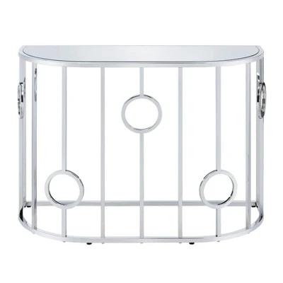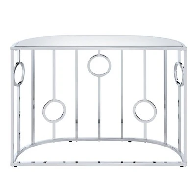 Make a stylish and sleek statement in your space with this understated and chic console sofa table, featuring an airy openwork design and artistic look that’s perfect for transitional and contemporary aesthetics alike. Defined by art deco design with a silver chrome-finished metal base, this bold table brings a bit of eye-catching appeal to your look, the glass top lets you stage any display in simple style. This design is the perfect pick for a tight hallway, entryway, or living room.