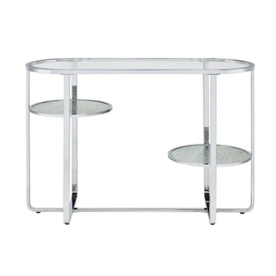 Catch the eye of friends and family alike with the stellar, modern style of this contemporary metal console table. Its oval shape and lower shelves bring eye-catching flair as the shelves create a lily pad effect with rippled glass and round silhouettes. The top is clear glass, ideal for showing off decor and greenery or flowers. A chrome finish completes the design with gleaming, modern appeal.