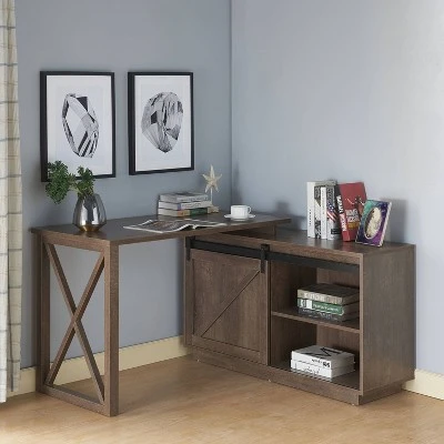 Give your home office character with this rustic farmhouse style desk. It comes with a sliding farmhouse style plank door that features two shelves behind it and an eye-catching X-cross leg design for added style. The corner desk is also finished on the backside, so you can position it to face the center of the room as well.