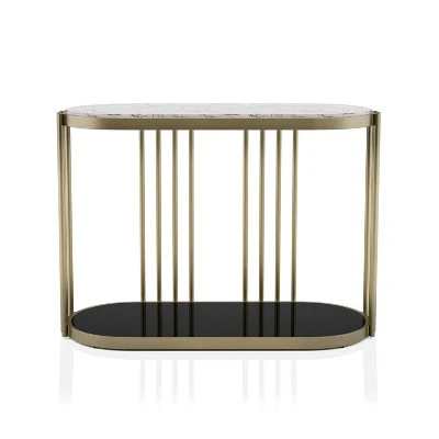 An antique brass-plated steel frame holds a faux white marble tabletop and a black tempered glass base on this sofa table. The mixed material look is an elegant style with functional quality. Use the base as extra shelf space for decor in your entryway.