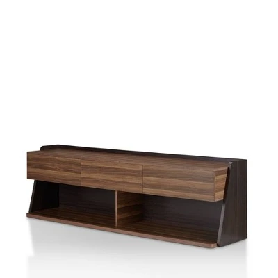 Updating your living space with a 70″ TV Stand will create a theater room experience. This two-toned stand showcases a clean-lined wood grain detail against a dark frame. The frame gives urban character with angled side panels and a lipped back. The light walnut finish gives you three upper drawers and two spacious bottom shelves.