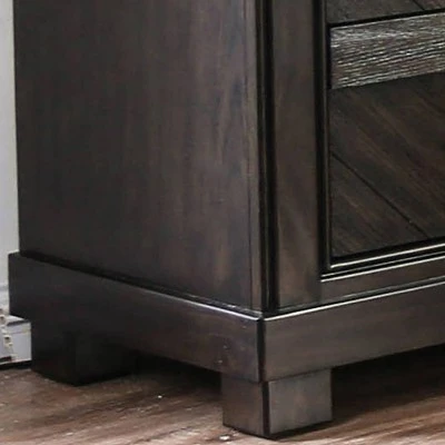 This magnificent Furniture of America Vrolen Transitional Espresso Nightstand. The drawer fronts feature diagonal wooden planks that meet to form a “V” pattern. The English dovetail construction of the nightstand drawers is a top of the line method that creates a stronger, sturdier drawer. The top drawer is lined in felt, a perfect spot for more delicate items. Enjoy the deep espresso finish of this 2-drawer nightstand and the sophisticated air it will lend to your space.